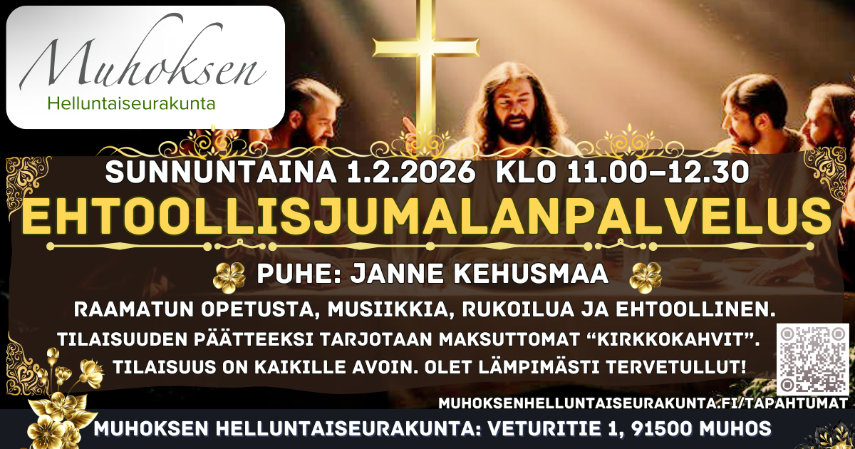 Ehtoollisjumalanpalvelus Puhe: Janne Kehusmaa + Lisää Google kalenteriin + iCal / Outlook export 00 päivää 00 tuntia 00 minuuttia 00 sekuntia Päivä helmi 01 2026 Aika 11:00 - 12:30 Jaa tapahtuma