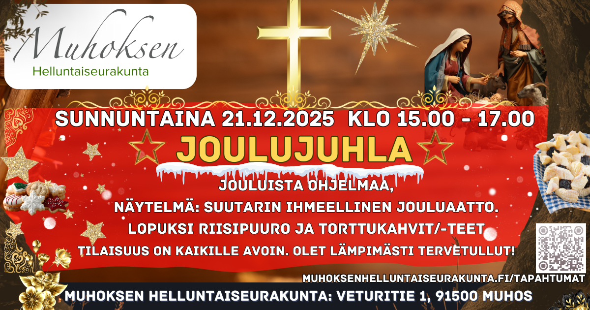 Joulujuhla Jouluista ohjelmaa Näytelmä: Suutarin ihmeellinen joulu Lopuksi riisipuuro ja torttukahvit/-teet + Lisää Google kalenteriin + iCal / Outlook export 00 päivää 00 tuntia 00 minuuttia 00 sekuntia Päivä joulu 21 2025 Aika 15:00 - 17:00 Jaa tapahtuma