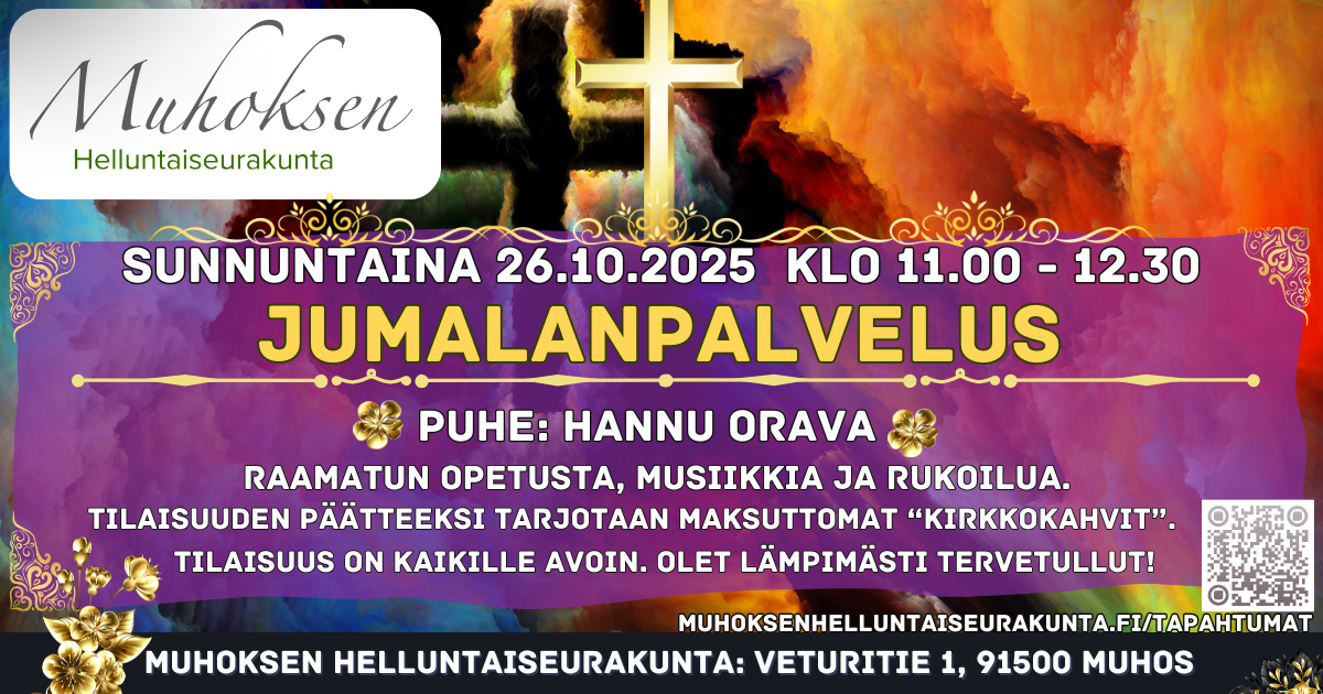 Jumalanpalvelus Puhe: Hannu Orava + Lisää Google kalenteriin + iCal / Outlook export Päivä loka 26 2025 Expired! Aika 11:00 - 12:30 Jaa tapahtuma