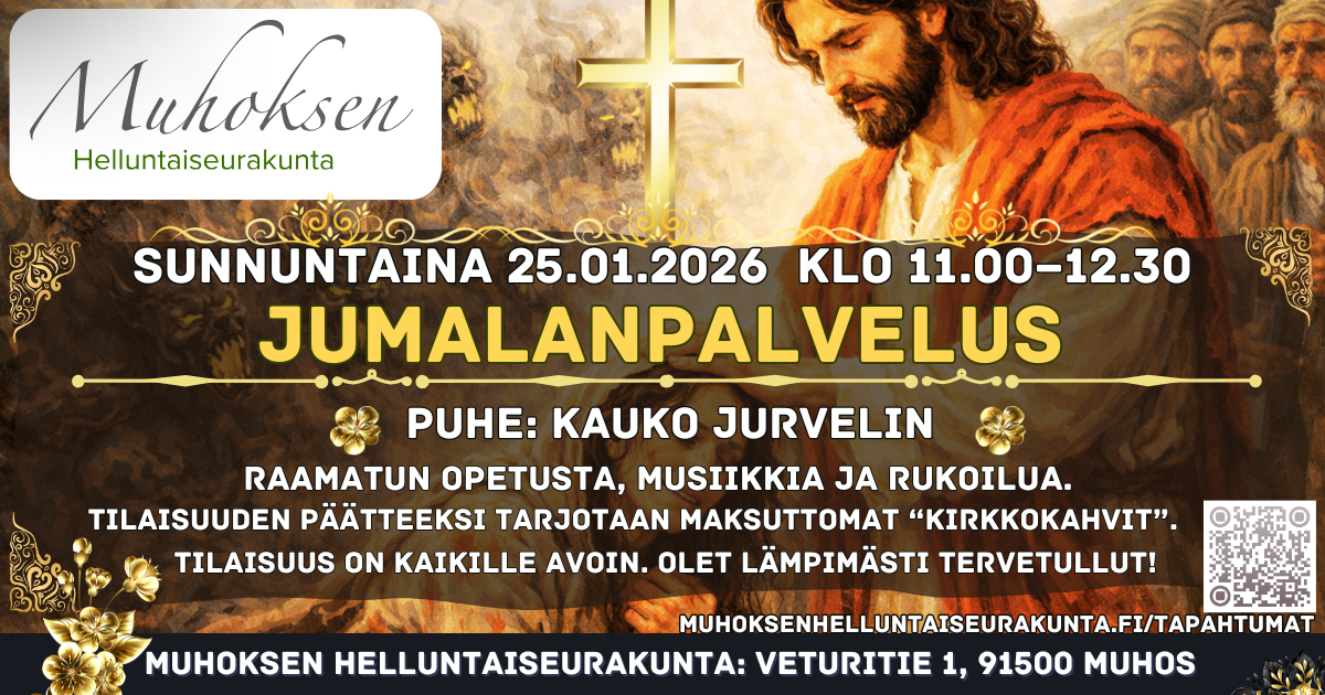 Jumalanpalvelus Puhe: Kauko Jurvelin + Lisää Google kalenteriin + iCal / Outlook export 00 päivää 00 tuntia 00 minuuttia 00 sekuntia Päivä tammi 25 2026 Aika 11:00 - 12:30 Jaa tapahtuma