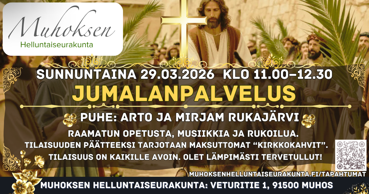 Jumalanpalvelus Puhe: Arto ja Mirjam Rukajärvi + Lisää Google kalenteriin + iCal / Outlook export Päivä maalis 29 2026 Expired! Aika 11:00 - 12:30 Jaa tapahtuma